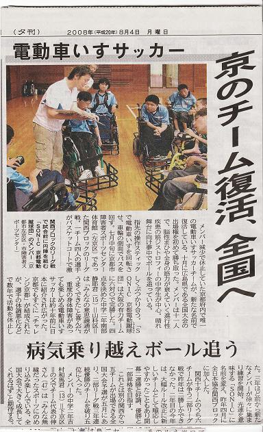 8月4日(月) 京都新聞 夕刊11面になんとわれら「SONIC 京都電動蹴球(しゅうきゅう)団」の記事がのっていました。